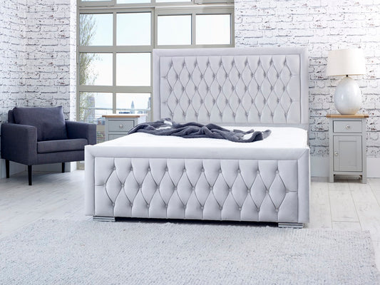 Ice Mist Bed - Handmade Upholstered Designer Panel Bed in Ice Color Velvet with 52-Inch Padded Headboard, 24-Inch Curved Footboard, Triple Layer Foam, Optional Gas Lift Storage, Custom Sizes & Free UK Delivery - Perfect for Elegant BedroomsRegular price From £350.00Regular priceUnit price / per-