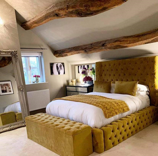 Samiraq Mustard Dreamscape Bed - Chesterfield Bed in Mustard Velvet with 54-Inch Wave Padded Headboard, 10-Inch Footboard, Triple Layer Foam, Optional Gas Lift Storage, Custom Sizes & Free UK Delivery - Perfect for Luxury Bedrooms