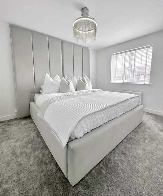Samiraq Grey Majestic Bed - Handmade Upholstered Broad Panel Bed in Cream Velvet with 60-Inch Padded Headboard, 10-Inch Footboard, Triple Layer Foam, Optional Gas Lift Storage, Custom Sizes & Free UK Delivery - Perfect for Luxurious Bedrooms