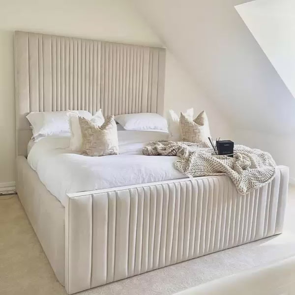 The Samiraq Creamery Delight Bed is a beautifully designed piece that combines modern elegance with exceptional comfort. Upholstered in luxurious 250 GSM plus velvet cream fabric, this designer bed features a panel padded headboard with a sophisticated Chanel design. With its stylish look and carefully crafted details, this bed is perfect for anyone looking to enhance their bedroom decor and sleeping experience.