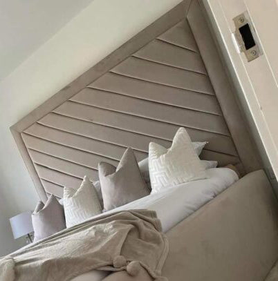 Samiraq Earthly Heaven Bed - Handmade Upholstered Light Brown Velvet Bed with 54-Inch Chanel Slanted Padded Headboard, 24-Inch Footboard, Triple Layer Foam, Optional Gas Lift Storage, Custom Sizes & Free UK Delivery - Perfect for Stylish Bedrooms