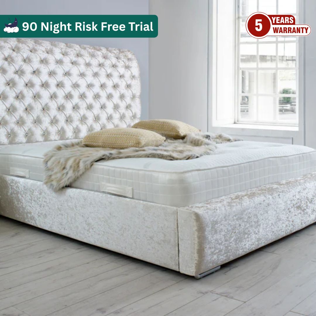 Elevate your bedroom with the regal elegance and practicality of the Samiraq Sensation Chesterfield Sleigh Upholstered Bed with Storage. Crafted in the UK with unparalleled attention to detail, this bed is a symbol of luxury, style, and functionality, offering a truly exceptional sleeping experience. Redefine your bedroom decor with the majestic allure of the Samiraq Sensation Bed.